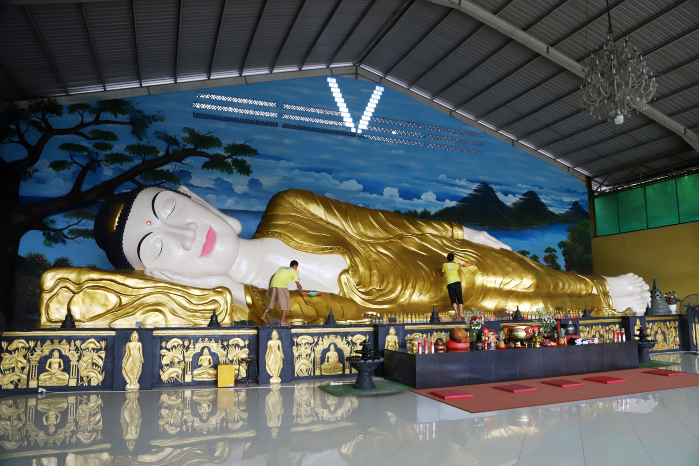 Pekerja melakukan bersih-bersih di patung Buddha tidur di Vihara Buddha Dharma dan 8 Pho Sat, Desa Tonjong, Tajurhalang, Kabupaten Bogor, Jawa Barat, Jumat (24/5/2024). Bersih-bersih dalam persiapan kegitan Puja Bakti Waisak yang akan diselenggarakan pada