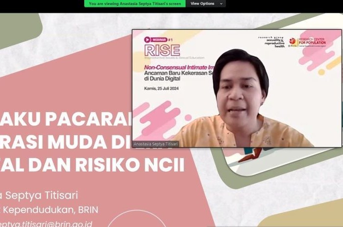 Peneliti Pusat Riset Kependudukan BRIN Anastasia Septya Titisari dalam seminar secara daring di Jakarta, Kamis (25/7). (Sean Filo Muhamad/Antara)