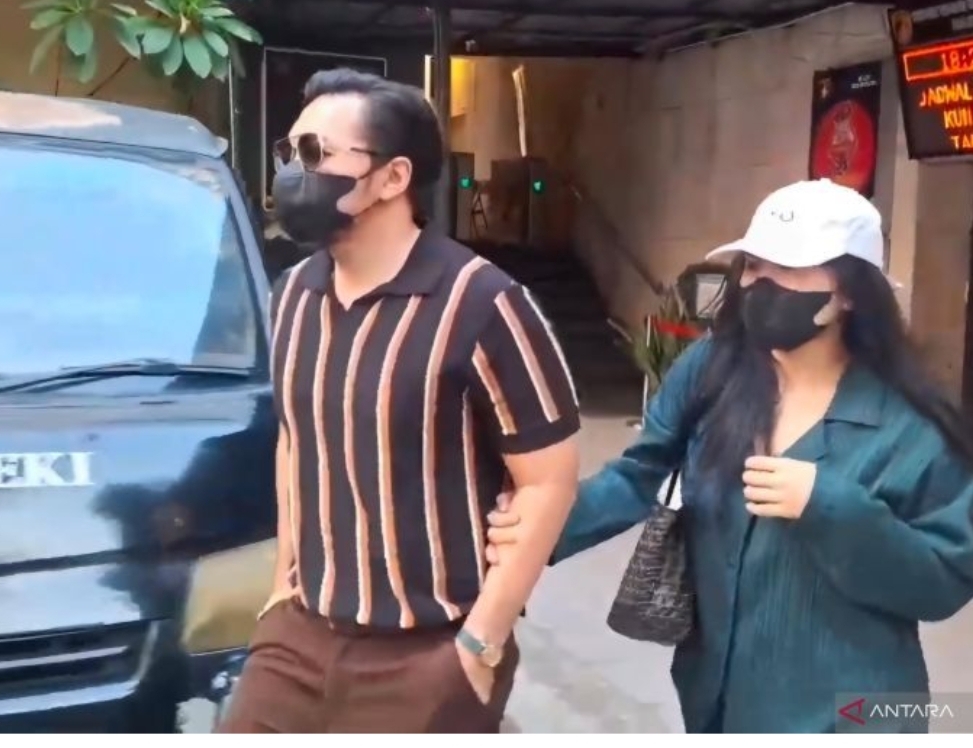 Musisi David Bayu bersama anaknya, Audrey Davis, saat di Polda Metro Jaya, Selasa (6/8/2024). (ANTARA/Ilham Kausar)