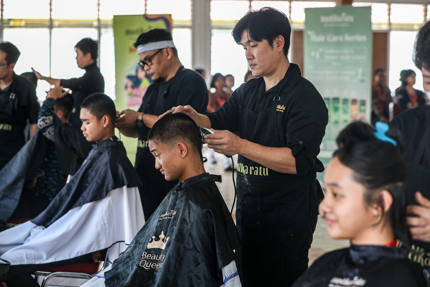 Calon Pasukan Pengibar Bendera Pusaka (Paskibraka) melakukan prosesi potong rambut saat pemusatan diklat Paskibraka 2024 di Jakarta, Minggu (14/7/2024).