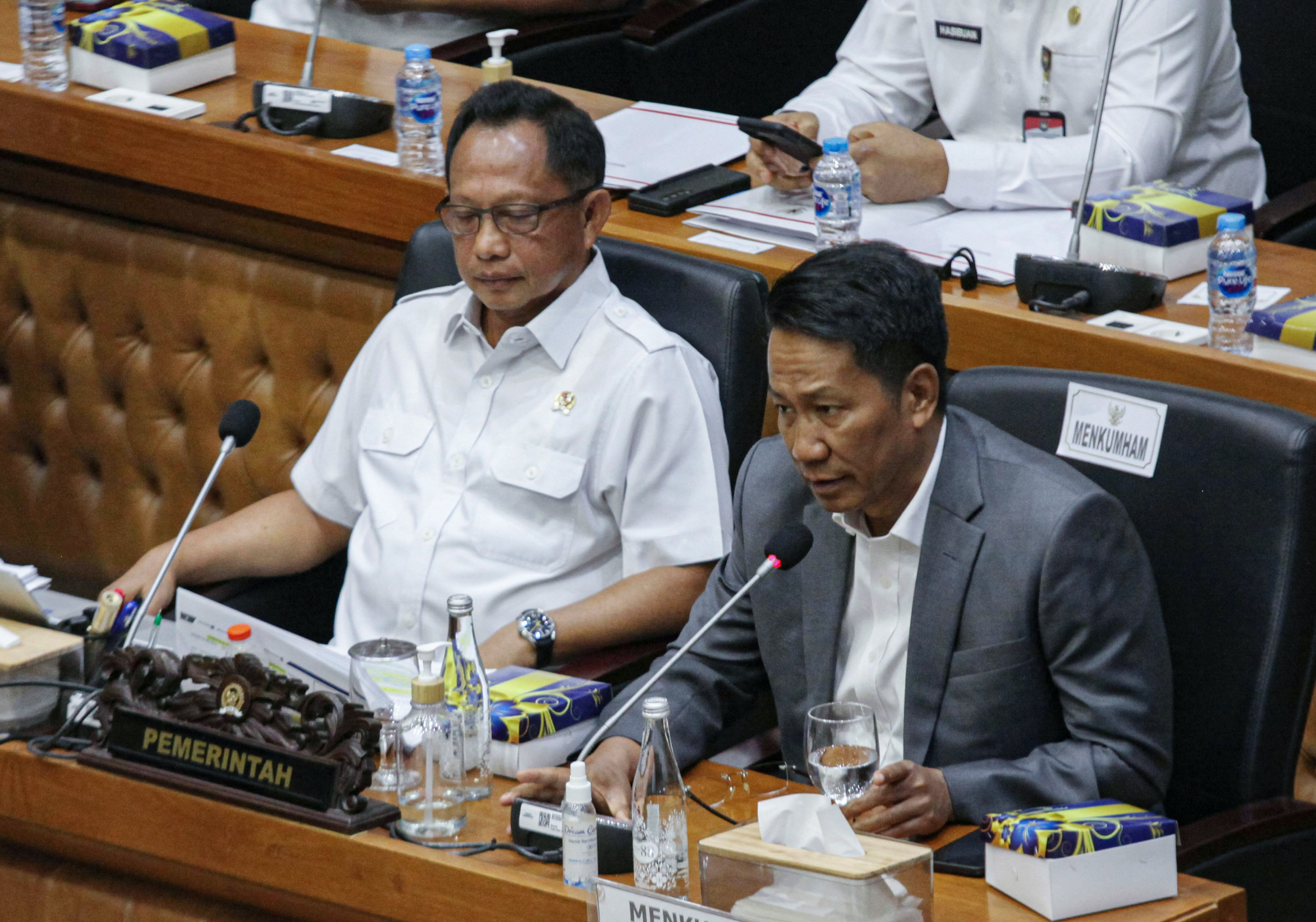 Menteri Hukum dan HAM Supratman Andi Agtas bersama Mendagri Tito Karnavian mengikuti rapat kerja dengan Badan Legislasi DPR terkait pembahasan RUU Pilkada di Kompleks Parlemen, Senayan, Jakarta, Rabu