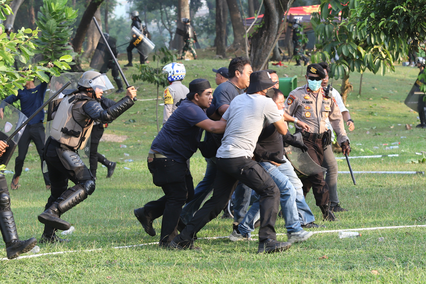Polisi mengamankan salah satu pengunjuk rasa saat saat bentrok aksi menolak pengesahan revisi UU Pilkada di depan Gedung DPR, Jakarta, Kamis (22/8/2024). Aksi menolak upaya revisi Undang-undang Pilkada oleh DPR RI tersebut berakhir ricuh dengan pihak kepo