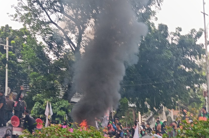 Aksi demo driver ojol di Kawasan Patung Kuda, Jakarta Pusat, Kamis (29/8) ricuh. (Tazkia Royyan/JawaPos.com)