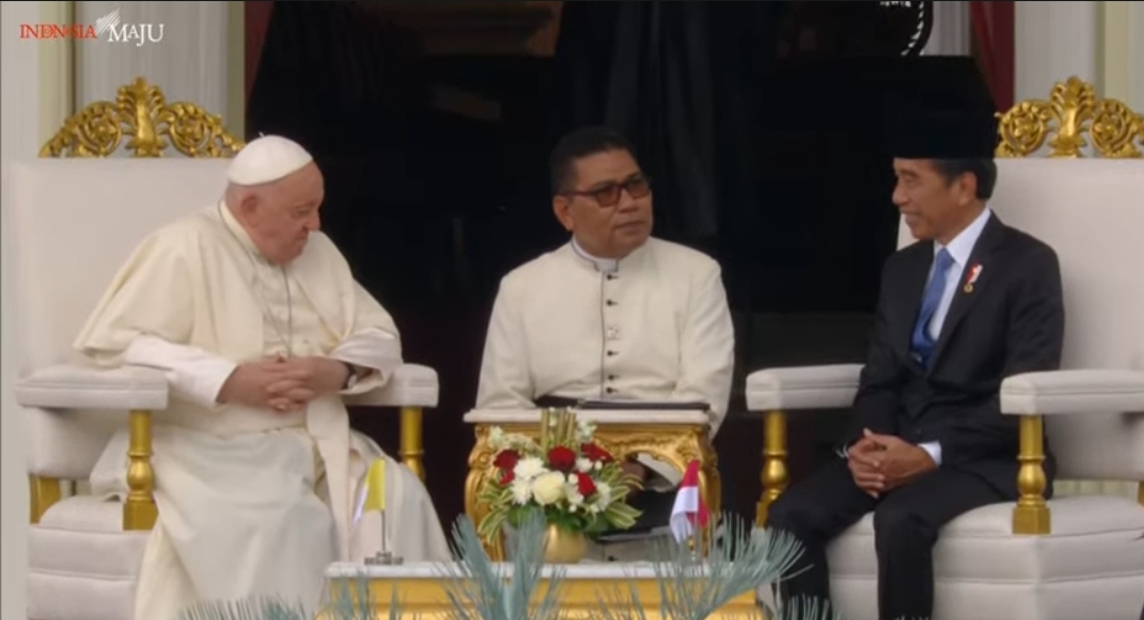 Presiden Joko Widodo (Jokowi) saat menggelar pertemuan dengan Pemimpin Tertinggi Gereja Katolik Dunia, Paus Fransiskus di Istana Merdeka, Jakarta, Rabu (4/9). (Youtube Setpres)