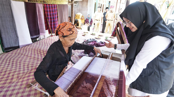 Bupati Banyuwangi Ipuk Fiestiandani mengunjunginya perajin tenun tradisional di sela Bupati Ngantor di Desa (Bunga Desa) di desa Jambesari, Senin (9/9/2024). (Istimewa)
