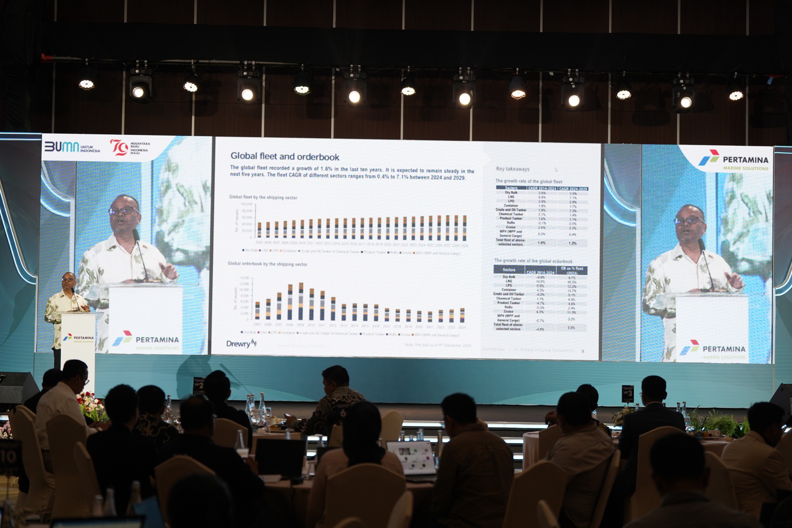 Krishna memaparkan bahwa selama 10 tahun terakhir, armada global mencatat pertumbuhan sebesar 1,6%. Diperkirakan pertumbuhan ini akan tetap stabil dalam lima tahun ke depan. Untuk periode 2024 hingga 2029, Laju Pertumbuhan Majemuk Tahunan/Compound Annual Growth Rate(CAGR) armada di berbagai sektor berkisar antara 0,4% hingga 7,1%. Di mana, Armada Indonesia telah tumbuh dengan (CAGR) sebesar 3,3% dalam sepuluh tahun terakhir. Hal ini menandakan industri maritim ke depan akan semakin maju dan pelaku industri harus siap bersaing secara nasional maupun internasional.