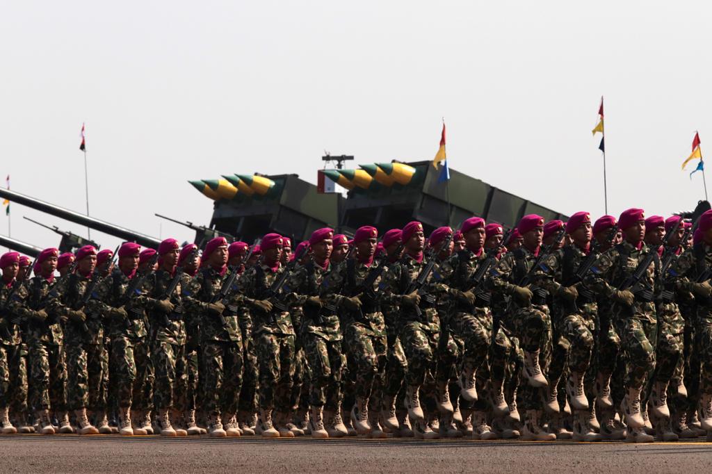 Pasukan berbaris pada HUT TNI Ke-74 di Lanud Halim, Jakarta, Sabtu (5/10). Foto: Dery Ridwansah/ JawaPos.com
