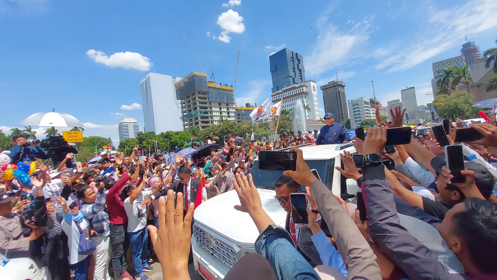 Warga datang untuk menyambut iring-iringan Presiden dan Wakil Presiden Prabowo Prabowo Subianto dan Gibran Rakabuming Raka. (Ryandi Zahdomo/JawaPos.com)