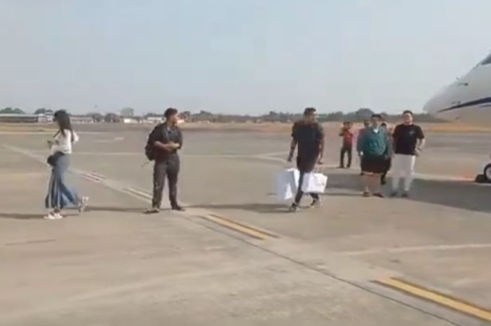 Tangkapan layar potongan video viral kedatangan pesawat jet pribadi yang digunakan putra bungsu dan menantu Presiden Joko Widodo (Jokowi), Kaesang Pangarep dan Erina Gudono. (Platform X)