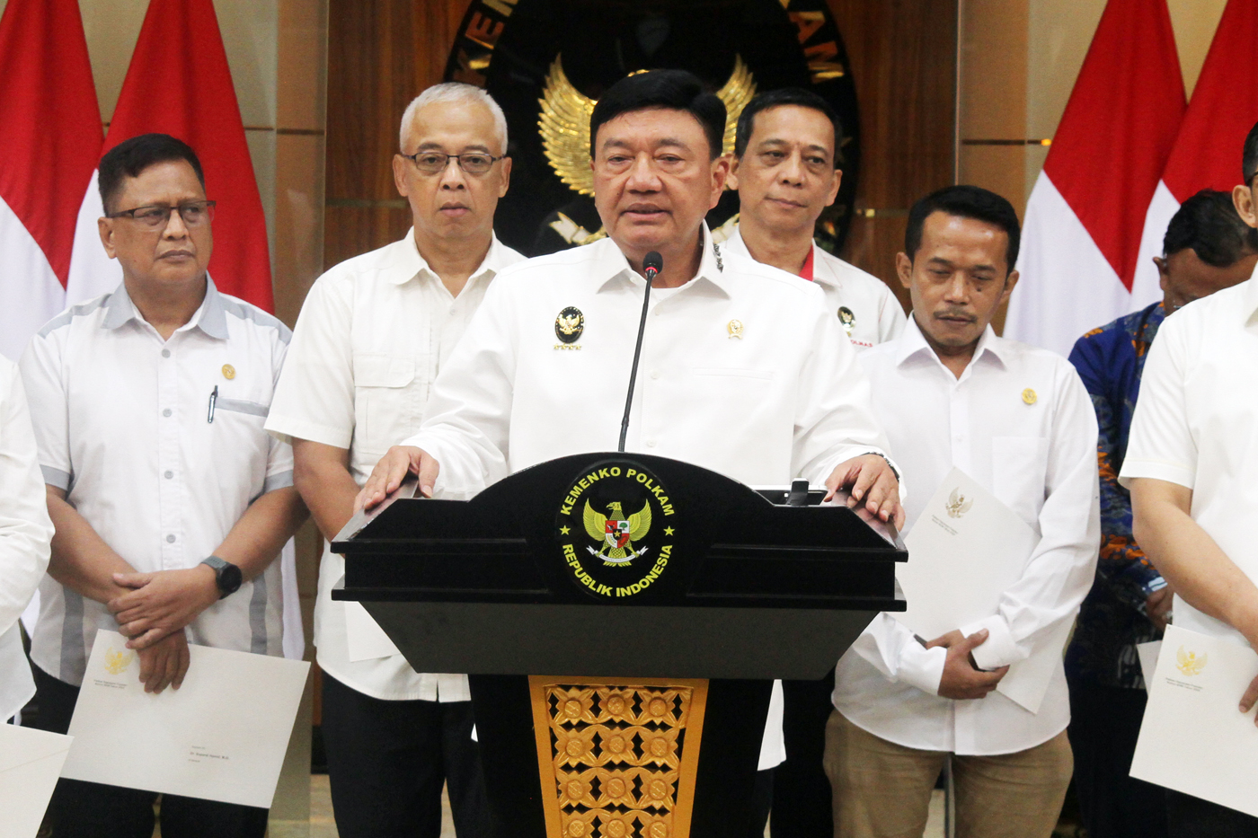 Menteri Koordinator Bidang Politik dan Keamanan sekaligus Ketua Kompolnas Budi Gunawan saat konferensi pers usai rapat dengan komisioner Kompolnas periode 2024-2028 di Kemenko Polkam, Jakarta, Senin (11/11/2024). (Dery Ridwansah/ JawaPos.com)