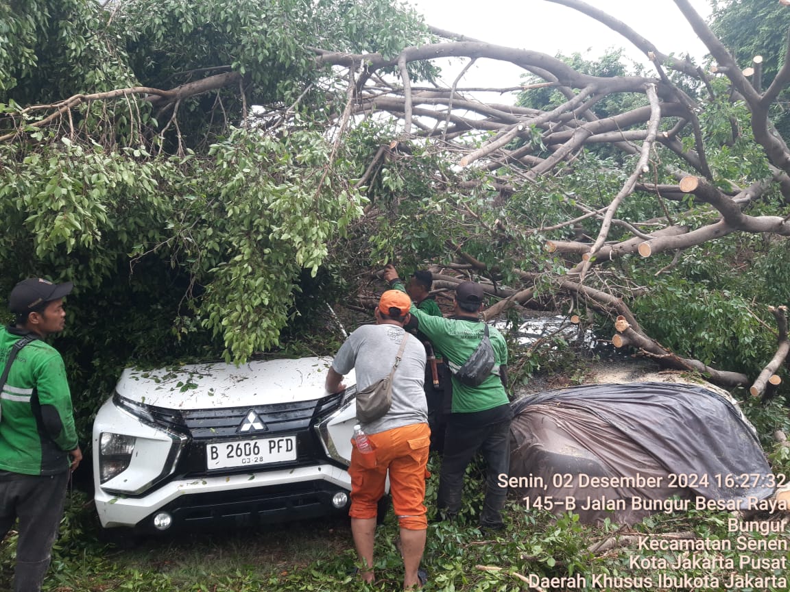 JawaPos.com - Jakarta Pusat dilanda cuaca ekstrem berupa hujan deras yang disertai angin kencang pada Senin (2/12/2024). Akibatnya, sebanyak 48 pohon terdampak yang terdiri dari 27 pohon mengalami patah cabang (sempal) dan 21 lainnya tumbang.
