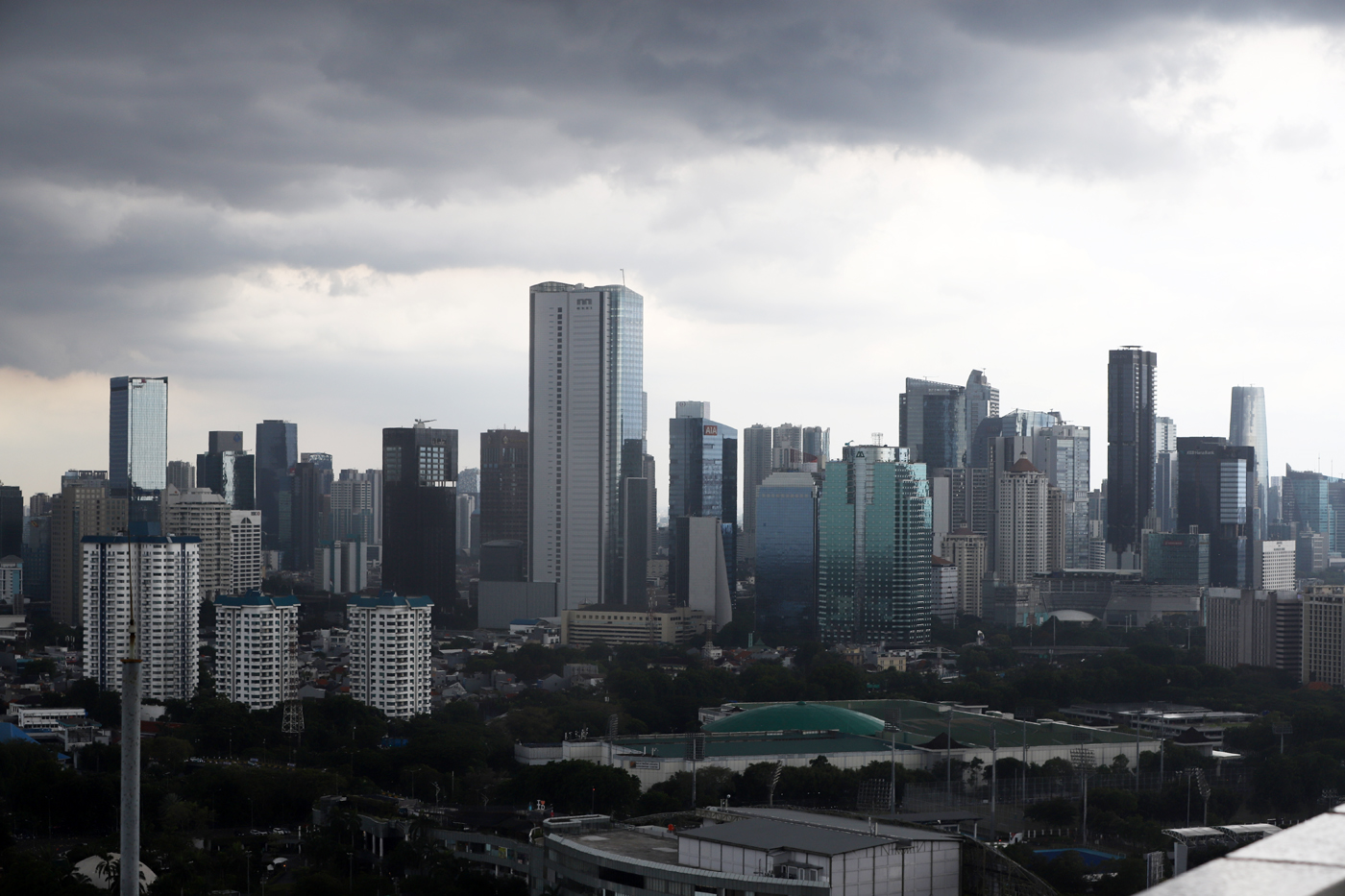 Cuaca Awan hitam tebal menyelimuti kawasan perkantoran dan permukiman di Wilayah Sudirman-Thamrin di Jakarta Pusat. (Dery Ridwansah/ JawaPos.com)