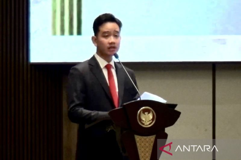 Wakil Presiden RI Gibran Rakabuming Raka memberikan sambutan dalam acara pelantikan Pengurus Pusat (PP) Pemuda Katolik Periode 2024–2027 di Gedung Konferensi Wali Gereja (KWI). (ANTARA)