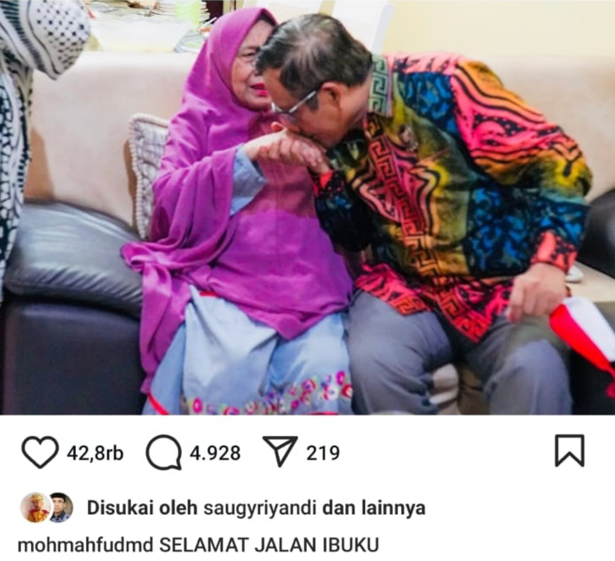 "Selamat jalan Ibu. Bu, kepergianmu menghadap Sang Khalik ba'da shubuh pada Jumat pagi ini mengagetkan anakmu," tulis Mahfud dalam akun Instagram.