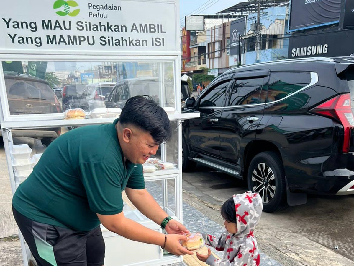 Pembagian paket makanan oleh karyawan Pegadaian pada minggu pertama dan ketiga setiap bulan di 32 lingkungan outlet Pegadaian wilayah Sumatera Selatan, Bangka Belitung, Lampung, Jambi, dan Bengkulu.