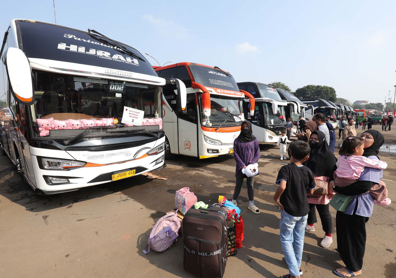 Sejumlah pemudik berjalan menuju bus yang akan mengantarkan mereka ke kampung halaman di Jiexpo, Kemayoran, Jakarta, Rabu (19/4/2023). PDI Perjuangan memberangkatkan 178 bus mudik gratis untuk ribuan pemudik dengan berbagai tujuan di Pulau Jawa dan Sumate