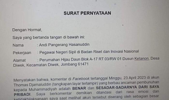 "Menyatakan bahwa komentar di Facebook tertanggal Minggu, 23 April 2023 di akun Thomas Djamaluddin yang berbau ancaman pembunuhan kepada Muhammadiyah adalah benar dan sesadar-sadarnya dari saya pribadi," tulis AP Hasanuddin dalam surat pernyataannya, Senin (24/4).
