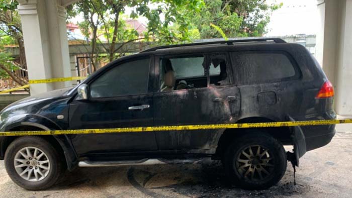 POLICE LINE: Mobil Mitsubishi Pajero nopol DA 7777 PU yang diduga dibakar dengan bom molotov.
