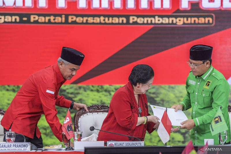 Ketua Umum PDIP Megawati Soekarnoputri (tengah) menerima dokumen dukungan dari Plt Ketua Umum PPP Mardiono (kanan) disaksikan Gubernur Jawa Tengah Ganjar Pranowo. (ANTARA)