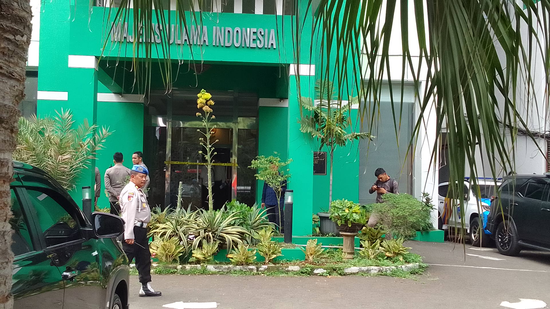Aparat kepolisian melakukan olah TKP setelah terjadi insiden penembakan di Kantor Pusat Majelis Ulama Indonesia (MUI) Menteng, Jakarta Pusat, Selasa (2/5).