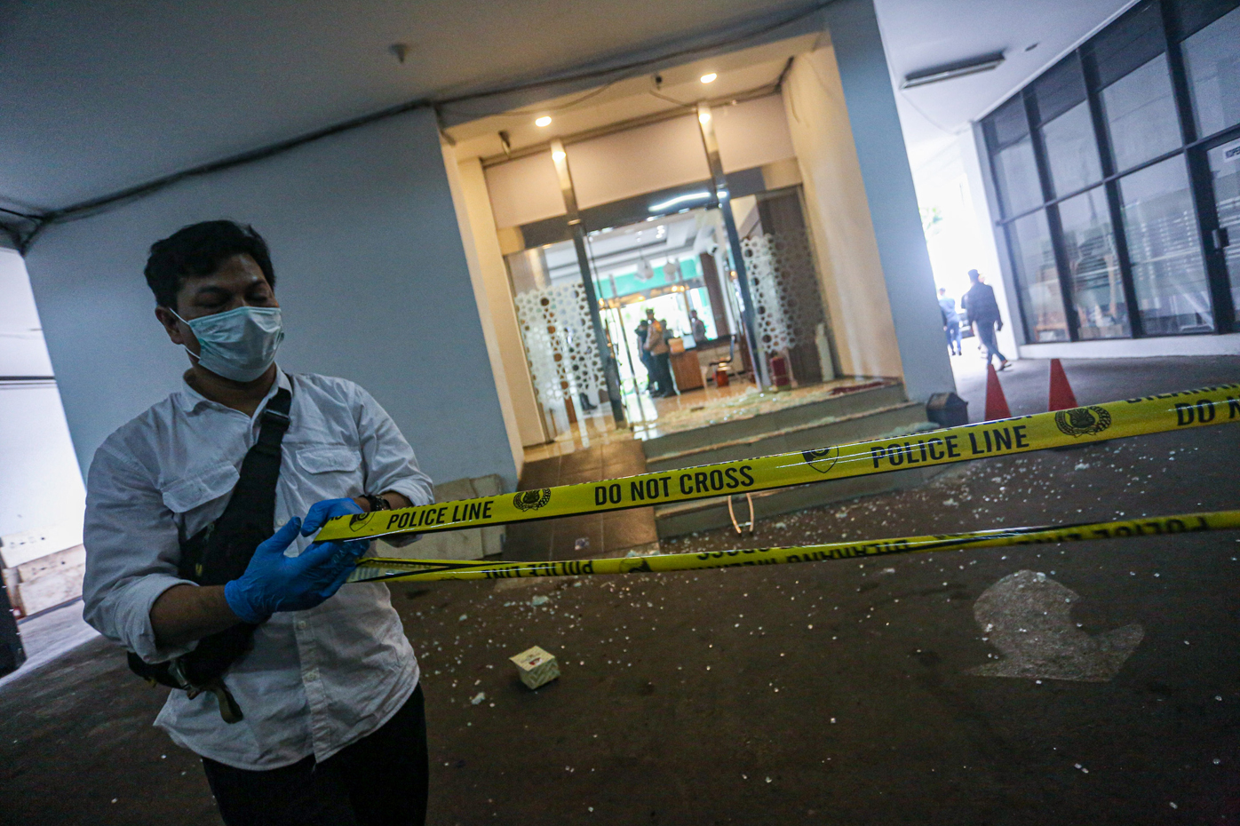Petugas kepolisian memasang garis polisi di tempat kejadian perkara (TKP) dugaan penembakan di Kantor Majelis Ulama Indonesia (MUI) Pusat, Jakarta, Selasa (2/5/2023).Berdasarkan keterangan Kapolda Metro Jaya Irjen Pol Karyoto pelaku penembakan Kantor Maje
