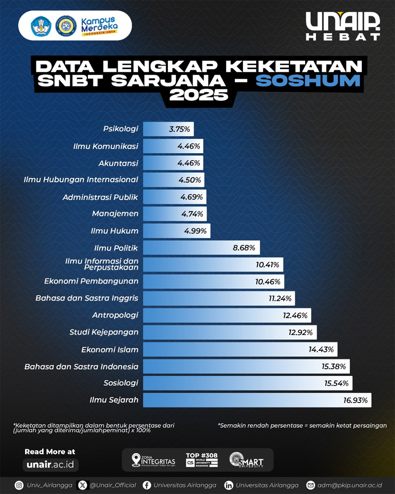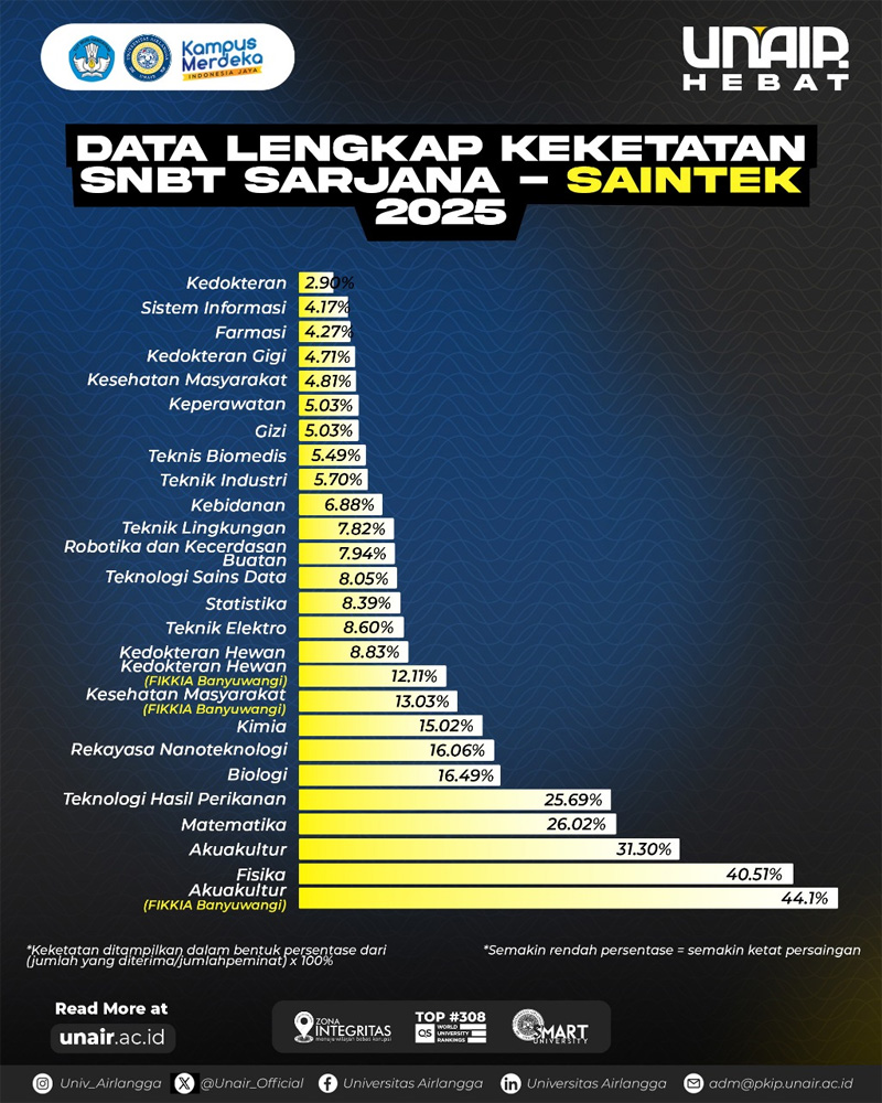 Sebagai gambaran, beberapa program studi di UNAIR memiliki tingkat keketatan yang tinggi berdasarkan jalur seleksi. Fakultas Kedokteran (FK) misalnya, mencatat keketatan 4,04% melalui SNBT, 2,90% melalui SNBP, dan 4,79% melalui jalur mandiri, menjadikannya program studi dengan persaingan tertinggi di rumpun saintek.