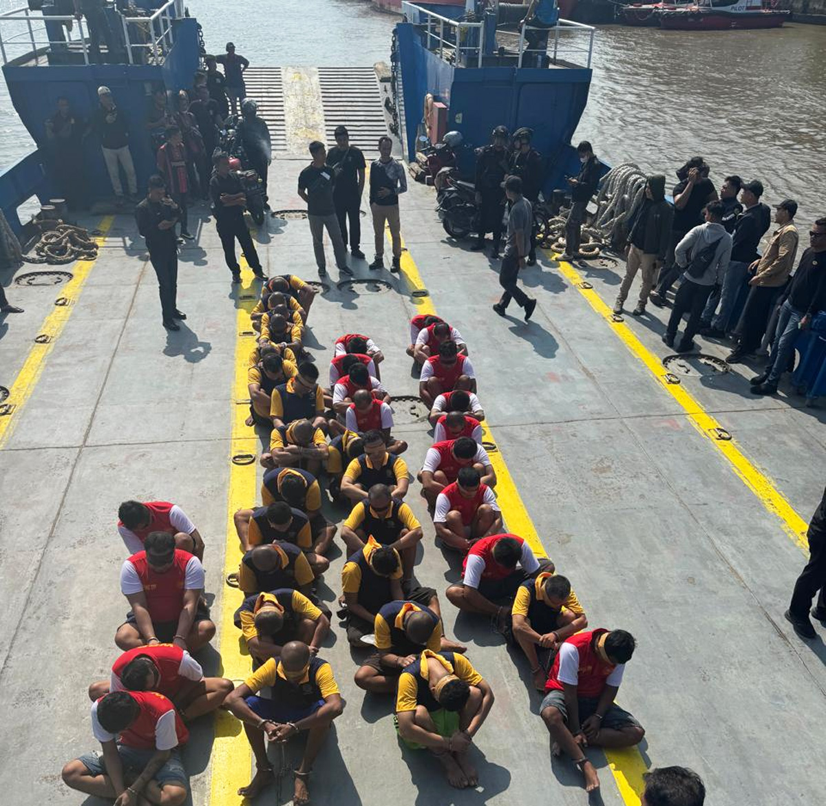 Sebanyak 37 warga binaan high risk Jawa Timur tiba di Lapas Super Maksimum Security Pulau Nusakambangan, Minggu (27/7). (Istimewa)