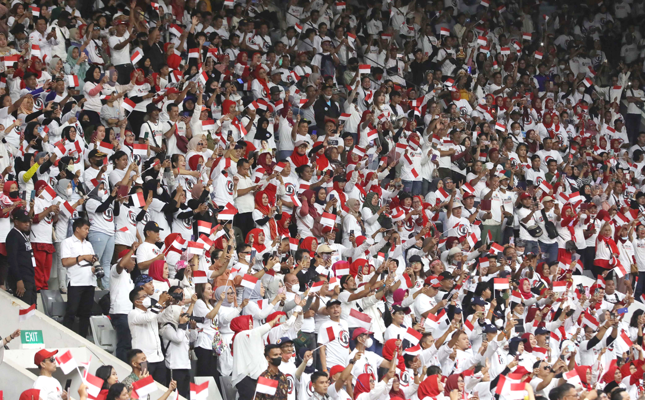 JARING ASPIRASI: Para relawan berkumpul di acara musyawarah rakyat relawan Jokowi di Istora Senayan, Jakarta, kemarin.