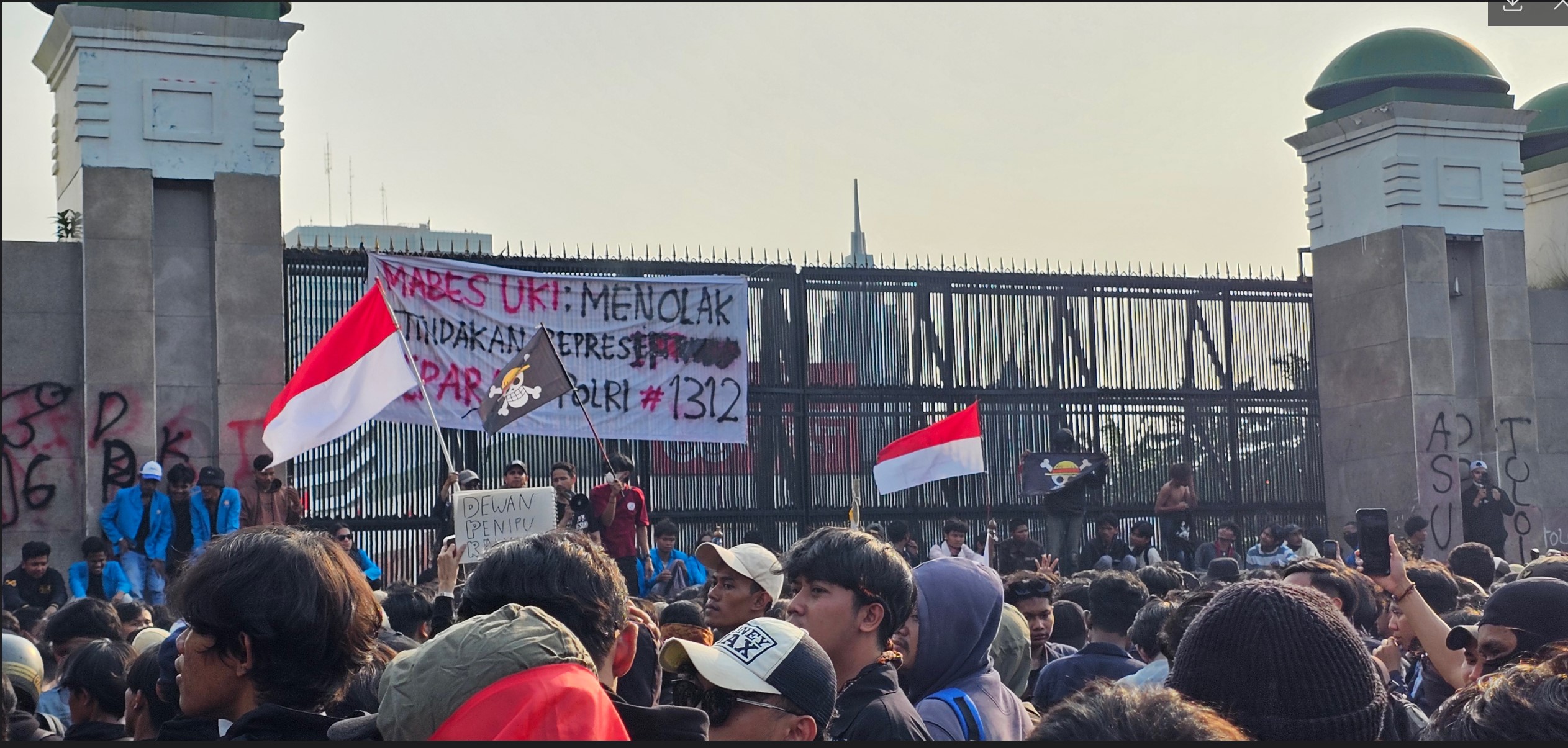 Pantauan JawaPos.com, massa turut mengibarkan bendera bergambar One Piece saat melakukan protes. Meski begitu, tidak terlihat mobil komando yang biasanya digunakan untuk menyuarakan aspirasi di depan gedung parlemen tersebut.