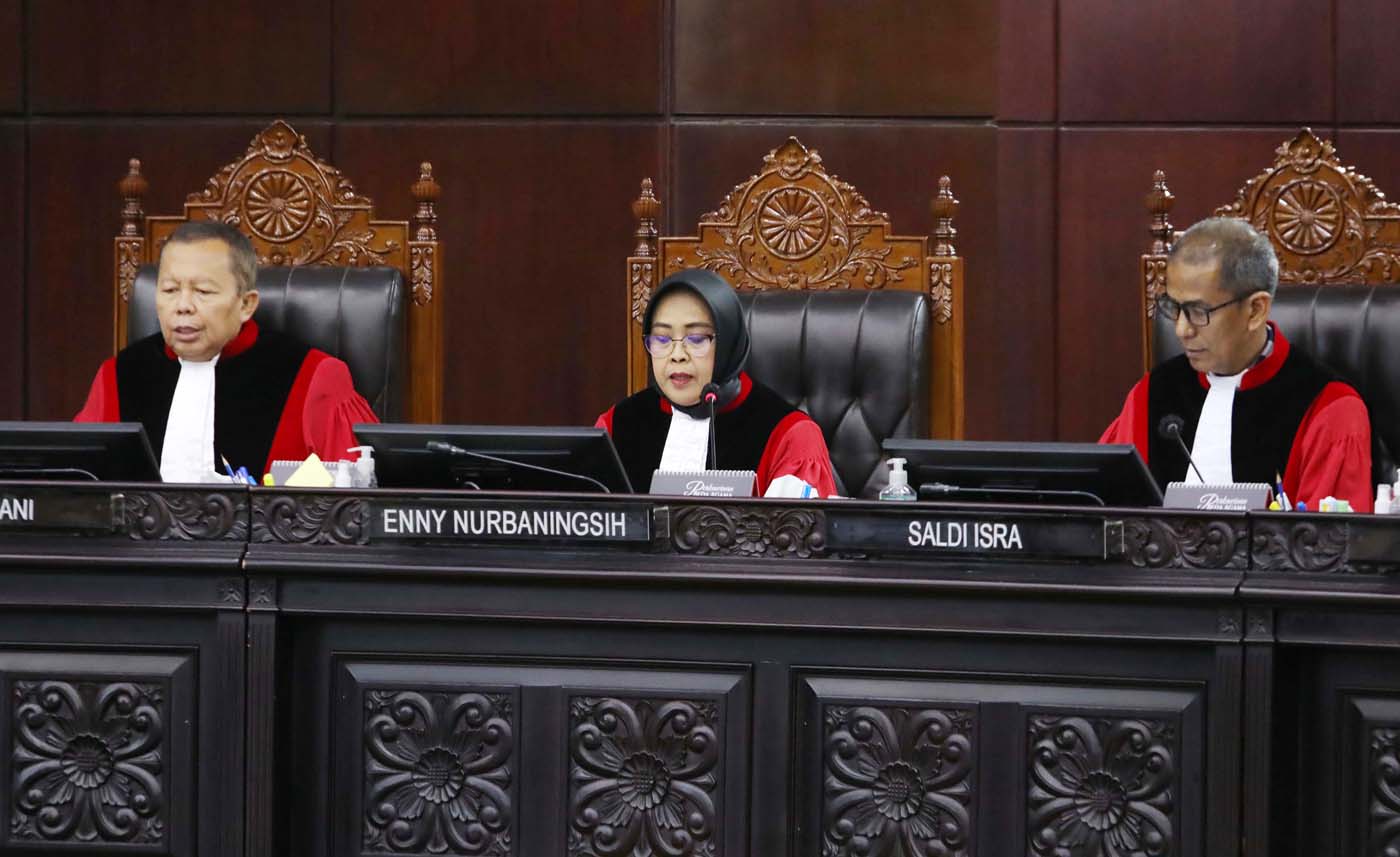 Hakim Mahkamah Konstitusi Enny Nurbaningsih membacakan dissenting opinion terkait putusan saat sidang putusan perselisihan hasil Pilpres 2024 di Gedung Mahkamah Konstitusi, Jakarta, Senin (22/4/2024).