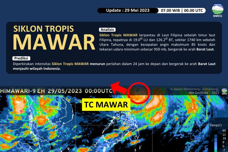 Ia menambahkan, kecepatan angin maksimum Siklon Tropis Mawar sebesar 85 knot atau 155 km per jam dengan tekanan udara minimum sebesar 950 milibar dan bergerak menjauhi wilayah Indonesia.