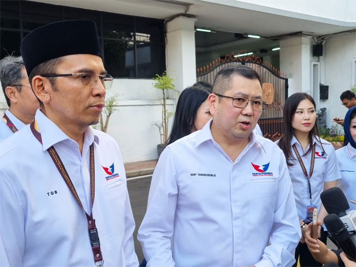 Tampak rombongan DPP Perindo yang hadir mendampingi Hary Tanoe, yakni Ketua Harian DPP Partai Perindo Tuan Guru Bajang (TGB) Muhammad Zainul Majdi, Sekretaris Jenderal DPP Partai Perindo Ahmad Rofiq, hingga bacaleg Partai Perindo Ustaz Yusuf Masur.