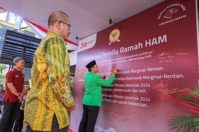 Plt Ketua Umum Partai Persatuan Pembangunan (PPP) Muhamad Mardiono bersama Komisi Nasional Hak Asasi Manusia (Komnas HAM) mendeklarasikan Pemilu Ramah HAM.