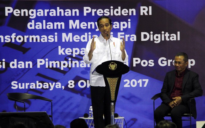 JawaPos.com - Presiden Joko Widodo mengadakan kunjungan kerja ke Jawa Timur. Minggu malam (8/10), Jokowi mendatangi kantor Jawa Pos di Graha Pena, Surabaya. Pada kesempatan tersebut, pria kelahiran Solo itu memberikan arahan terkait transformasi media di era digital kepada Direksi dan Pimpinan Jawa Pos Grup.