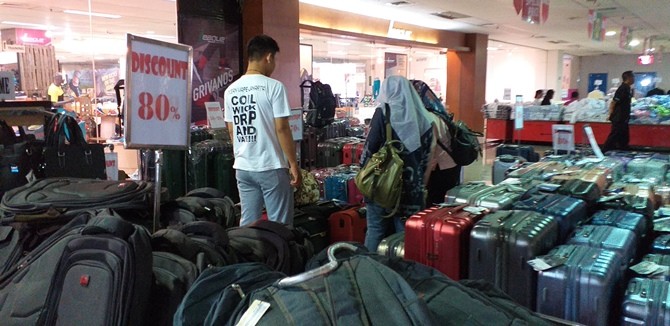 Bagi kalian yang akan jalan-jalan namun belum memiliki koper untuk tempat pakaian, kalian bisa langsung berkunjung ke sini. Sebab, koper dari ukuran kecil hingga besar ada diskon 80 persen dengan harga dasar yang bervariasi.
