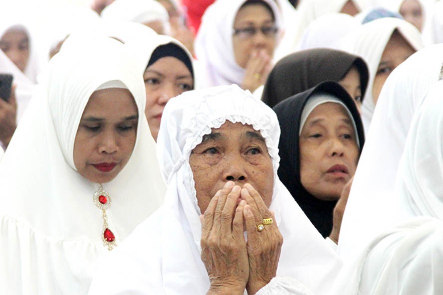 Jemaah Calon Haji asal Batam berdoa saat mengikuti pelatihan manasik dan pelepasan JCH Kota Batam di Aula Pusat Informasi Haji (PIH) Batam Center, Senin (1/7). JCH Kota Batam dilepas Wali Kota Batam muhammad Rudi bersama wakilnya, Amsakar Achmad. F. Cecep - Image