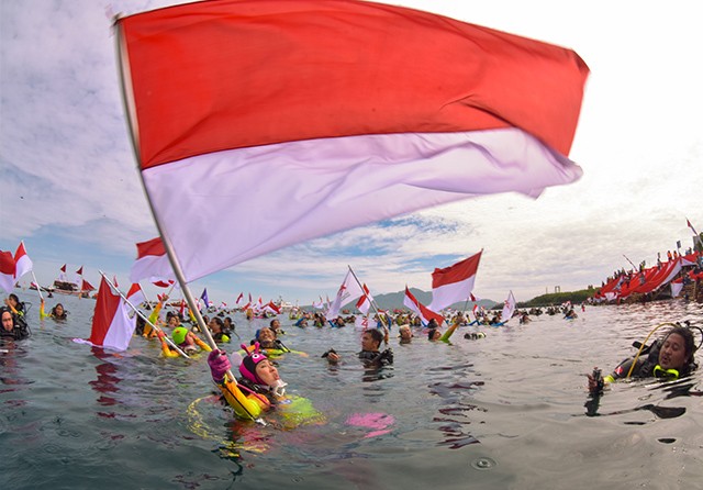 GEMBIRA: Selebrasi Wanita Selam Indonesia (WASI) usai berhasil mengibarkan bendera merah putih yang memecahkan rekor dunia. (WASI for JawaPos.com)