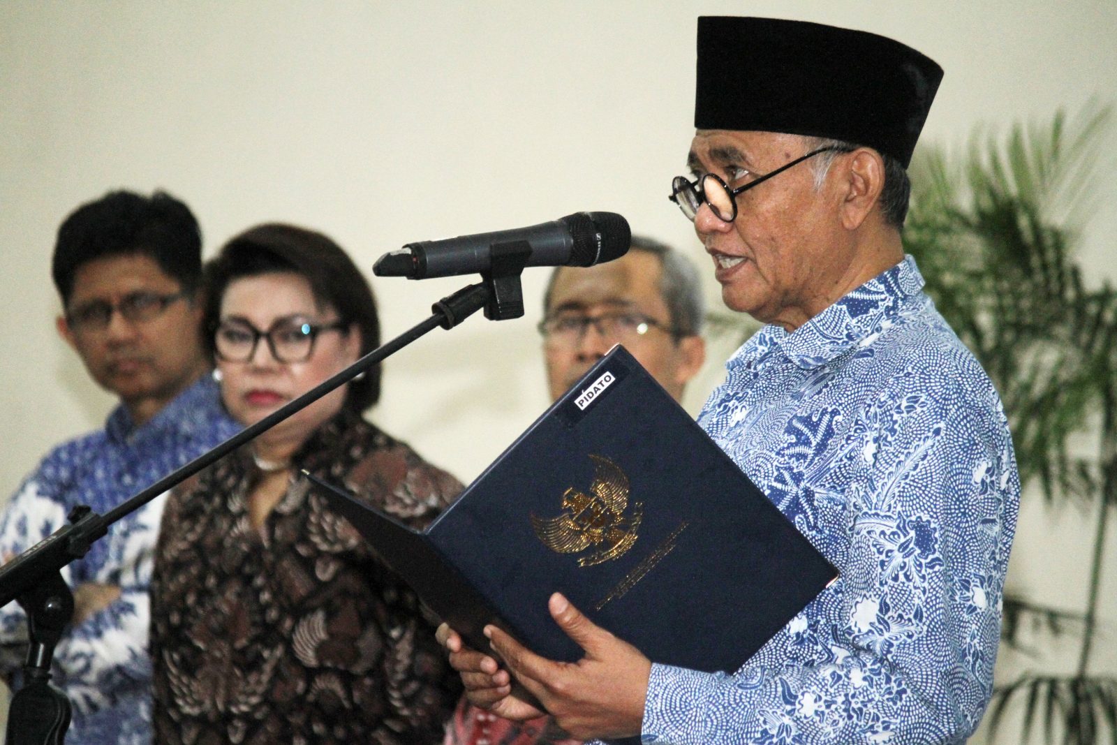 Ketua KPK Agus Rahardjo (kanan), bersama Wakil Ketua KPK Basaria Pandjaitan (kedua kiri), Alexander Marwata (kedua kanan) dan Laode M Syarif (kiri) saat melantik pejabat struktural KPK di Gedung Penunjang KPK, Jakarta, Senin (16/9/2019). Dua pejabat struk