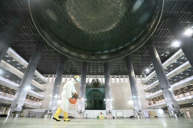 Masjid Istiqlal Jakarta melakukan sterilisasi area ibadah guna mencegah terjadinya penularan virus korona (COVID-19) . (Dery Ridwansah/JawaPos.com)