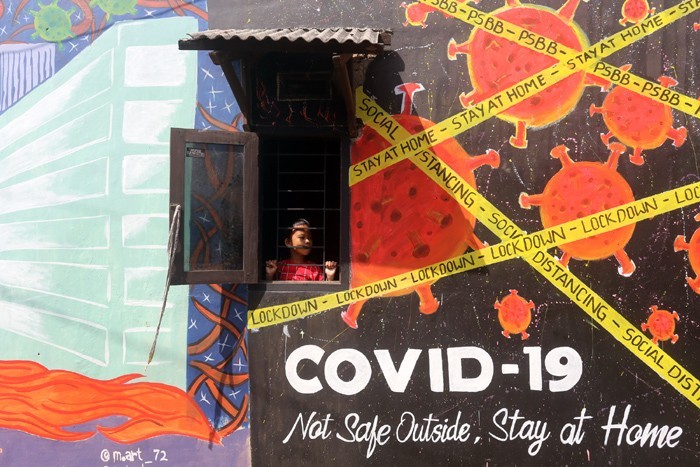 Seorang anak berada di jendela rumah yang bertuliskan mural ajakan untuk tetap dirumah di kawasan Depok, Jawa Barat, Kamis (16/4). Pemerintah menyatakan bahwa masih terjadi penularan virus corona di masyarakat yang membuat jumlah pasien Covid-19 kembali b