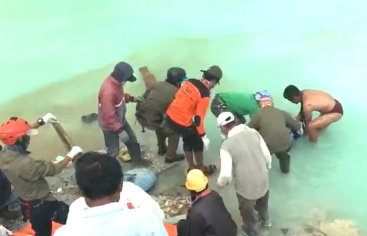 PENUH RISIKO: Tim SAR mengangkat jenazah Andik di danau kawah Gunung Ijen, Banyuwangi, kemarin (30/5). (RAMADA KUSUMA/JAWA POS RADAR BANYUWANGI)
