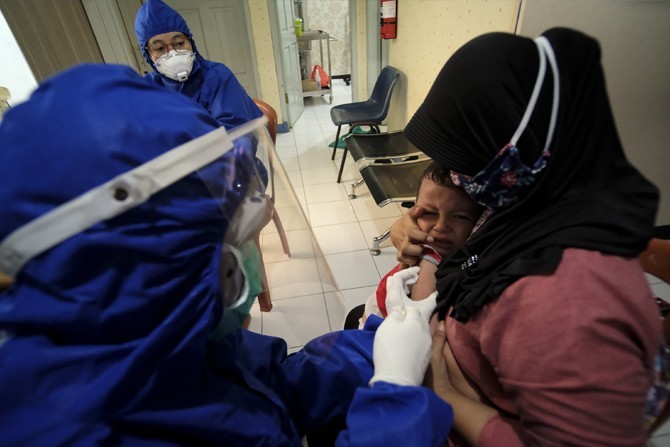 Petugas menggunakan alat pelindung diri (APD) memberikan imunsiasi kepada balita di Puskesmas Karawaci Baru, Kota Tangerang, Banten, JUmat (15/5/2020). Pelayanan imunisasi tersebut tetap dilakukan di tengah pandemi COVID-19 demi menjaga kesehatan anak den