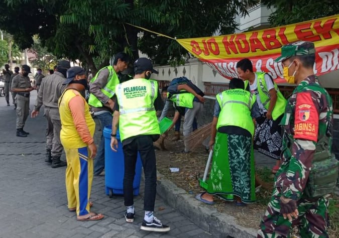 Pelanggar protokol kesehatan menyapu Jalan Jawa Kawasan GKB, Kabupaten Gresik, Jatim, akibat tidak memakai masker. Antara