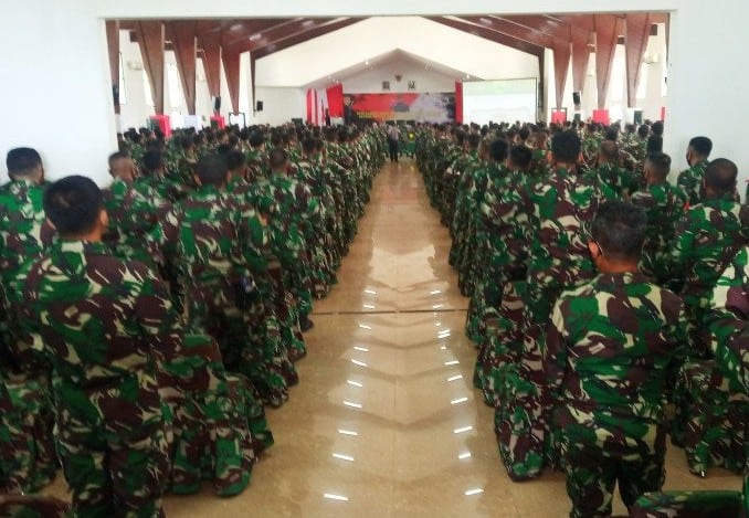 Ratusan pasukan BKO TNI saat menerima arahan dari Wakil Kepala Staf TNI AD Mayjen Moch Fachruddin di Markas Kodam XVIII/Kasuari pada Senin (13/7). Toyiban/Antara