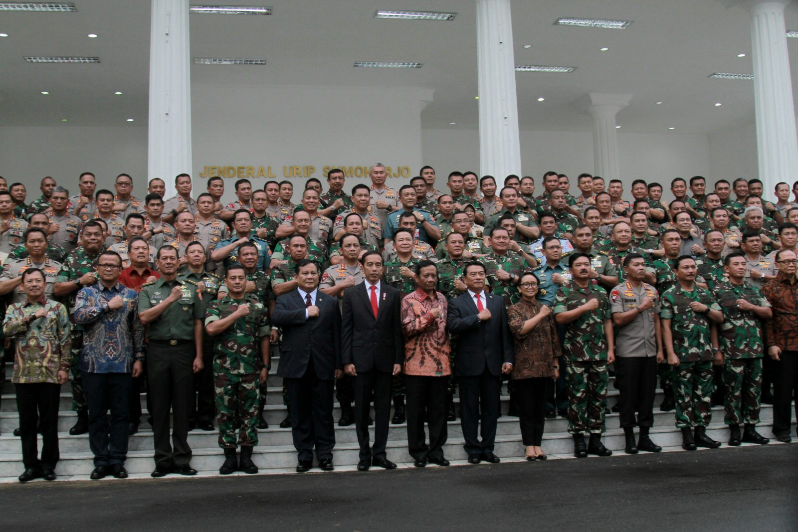 Presiden Joko Widodo bersama Menteri Pertahanan Prabowo Subianto saat menghadiri rapat pimpinan Kementerian Pertahanan 2020, Kamis (23/1/2020). Adapun dalam acara ini dihadiri juga oleh Menko Polhukam Mahfud Md, Panglima TNI Marsekal Hadi Tjahjanto, Kapo