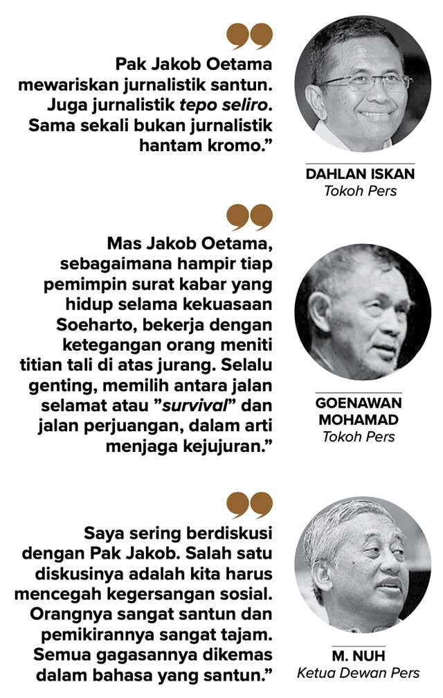 Konsistensi Jakob dalam memegang jurnalisme yang benar dan berimbang menjadi bukti bahwa pers berperan penting sebagai pilar demokrasi dan media pendidikan bagi masyarakat. ’’Pak Jakob konsisten dengan nilai jurnalisme yang dipegangnya, jurnalisme yang berdiri di atas semua golongan, dan berdasar kemajemukan Indonesia,’’ kata Puan.