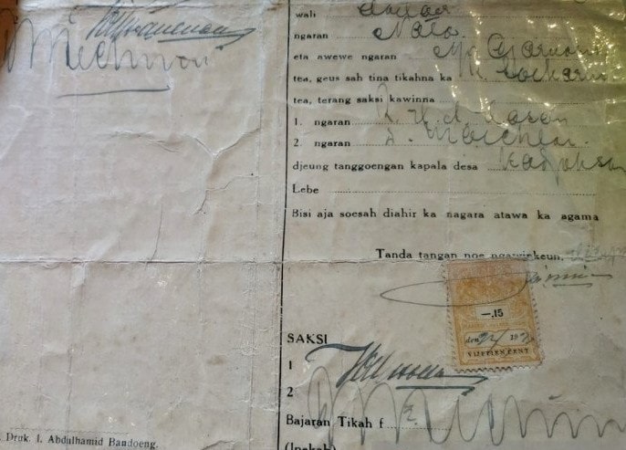 Dokumen surat nikah Inggit Garnasih dan Soekarno yang dimiliki ahli waris yang tinggal di Kota Bandung. Bagus Ahmad Rizaldi/Antara