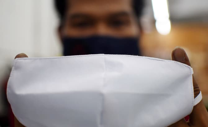 Pekerja menujukan masker tenaga medis di Pusat Industri Kecil, Penggilingan, Jakarta, Kamis (1/10/2020). Sejumlah usaha konveksi di kini memproduksi alat pelindung diri (APD) untuk memenuhi kebutuhan tenaga medis. Tak hanya APD, para pelaku usaha itu jug