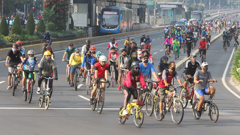 Warga ibukota bersepeda, berlalri dan berjalan kaki di sepanjang jalan Sudirman- MH Thamrin Jakarta, Minggu (2/8/2020). Pemprov DKI Jakarta meniadakan Car Free Day selama pandemi Covid-19, namun antusias warga Ibukota untuk tetap melakukan olahraga di lua