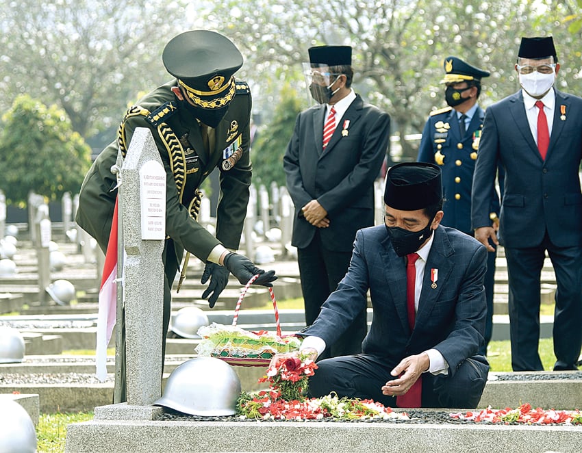 KHIDMAT: Jokowi saat berziarah di Taman Makam Pahlawan Kalibata, Jakarta, Selasa (10/11). (SETPRES)